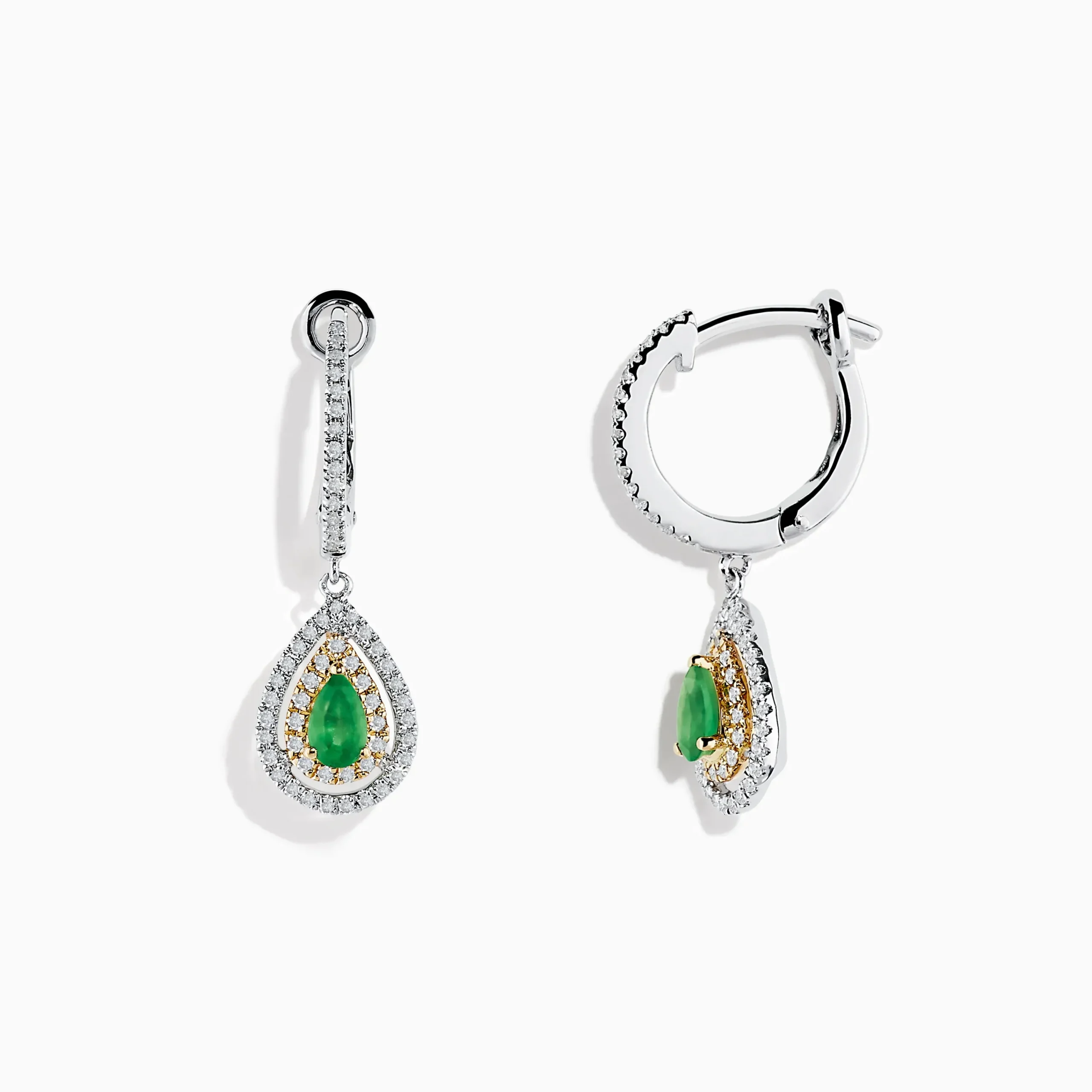 Effy 14K White & Yellow Gold Pear Shaped Double Diamond Halo Emerald Drop Earrings