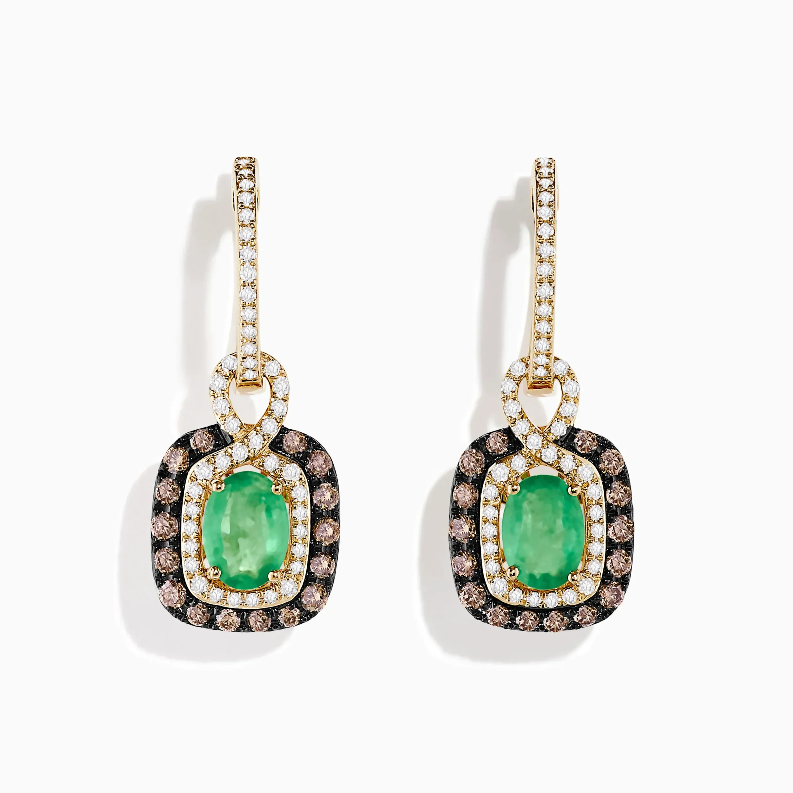14k Yellow Gold Brown & White Diamond Halo Emerald Drop Earrings