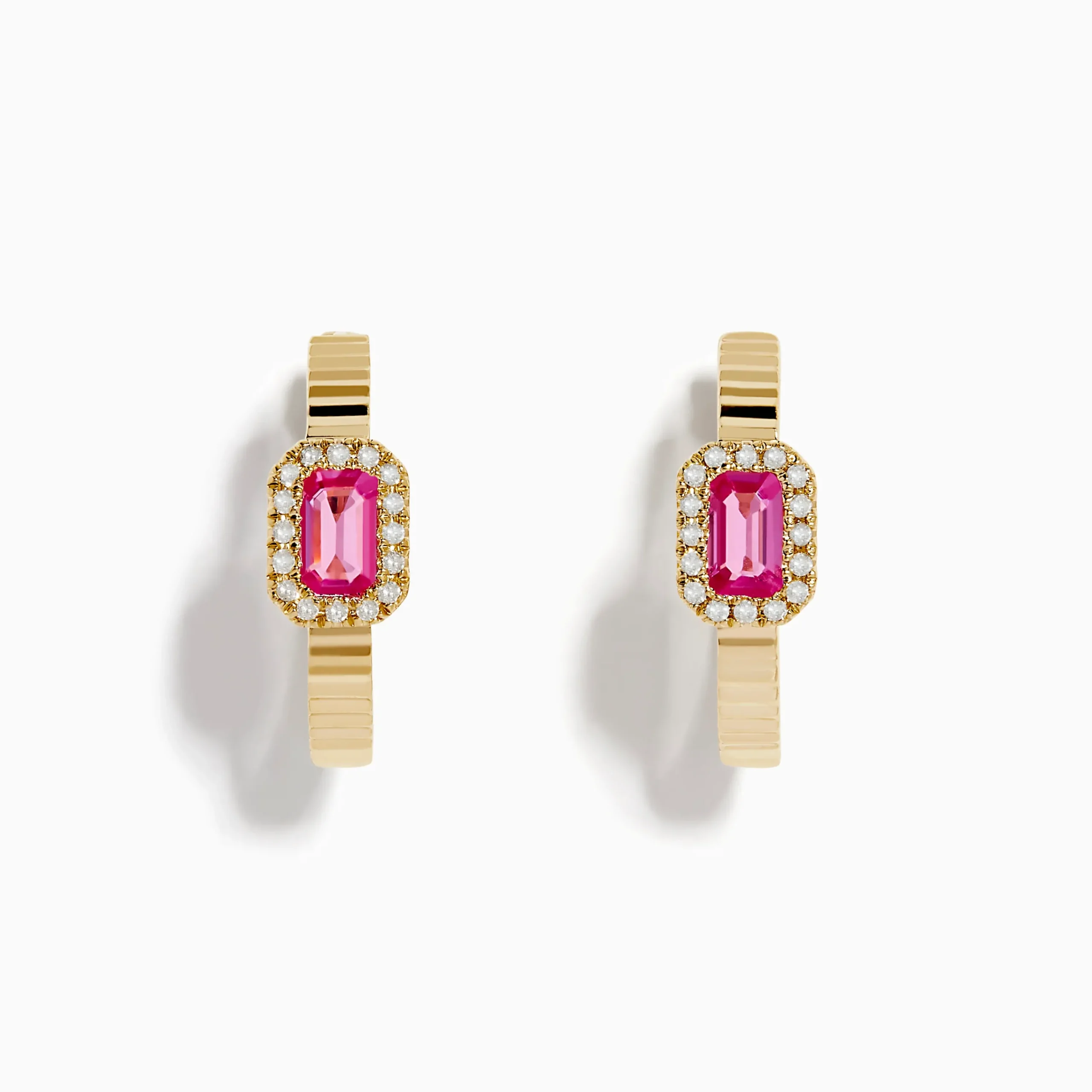 14K Yellow Gold Pink Sapphire and Diamond Hoop Earrings