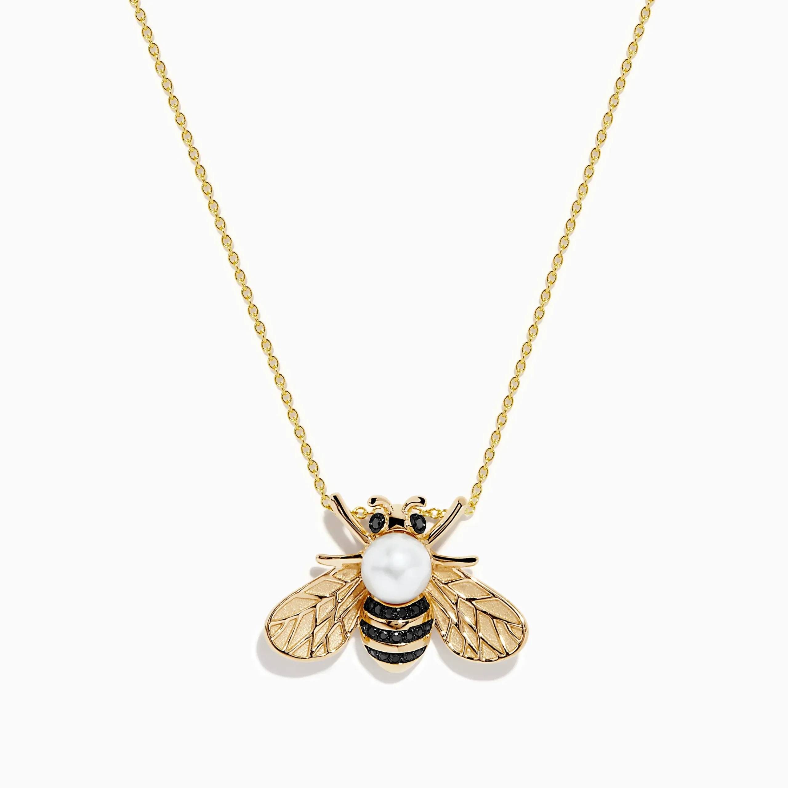 14K Yellow Gold Black Diamond, Freshwater Pearl Bee Pendant