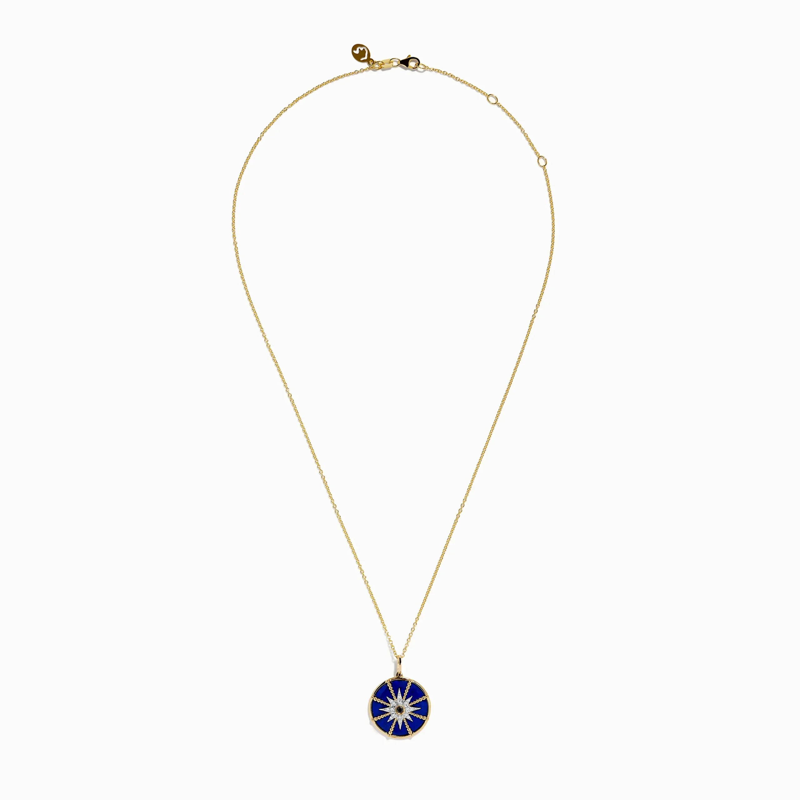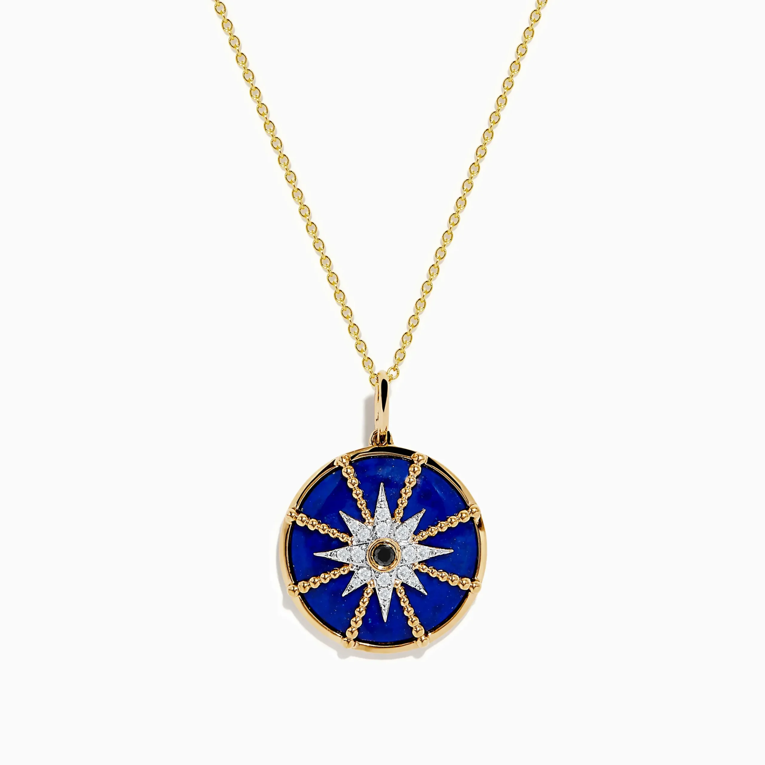 14K Yellow Gold Lapis, White and Black Diamond Compass Pendant