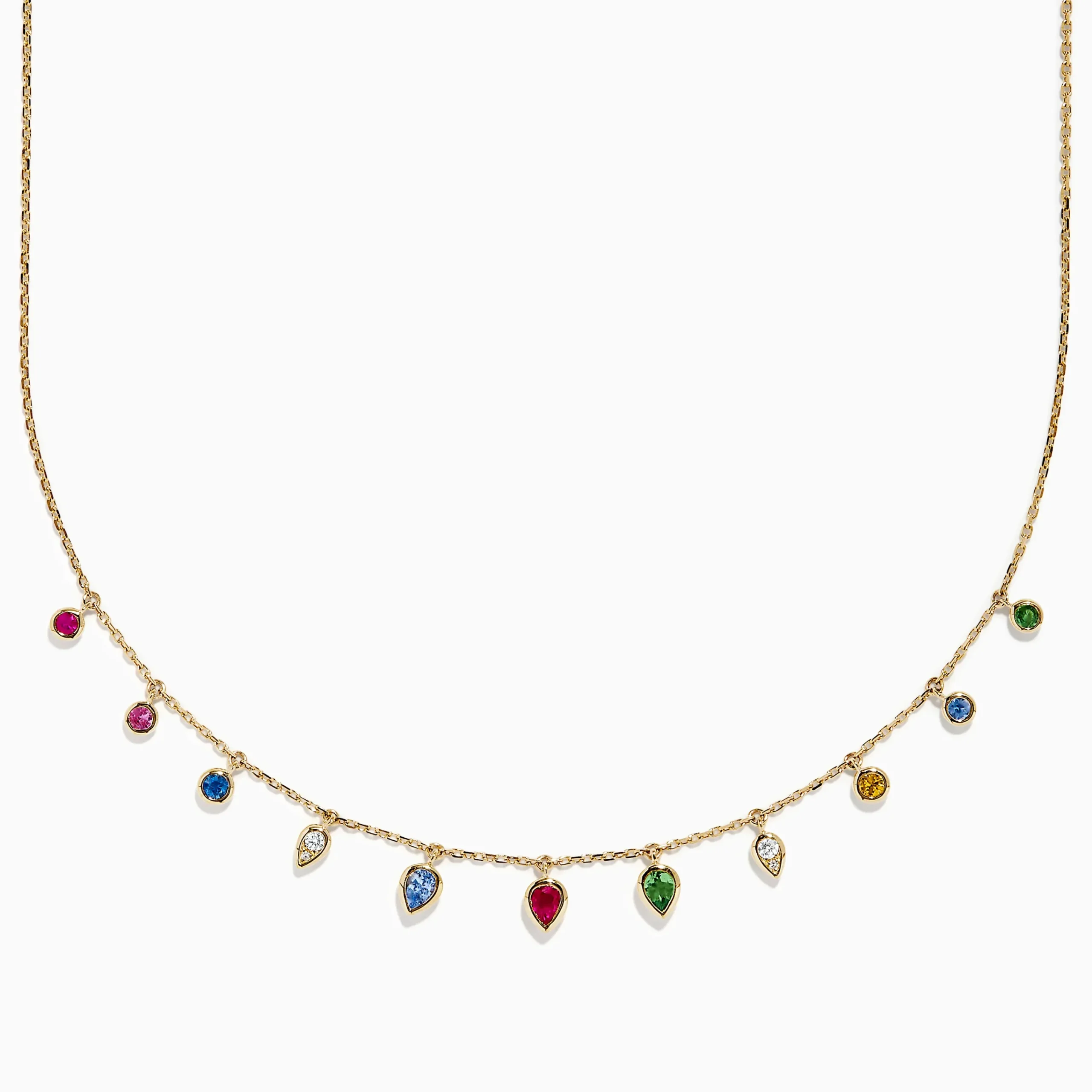 14K Yellow Gold Multi Sapphire Diamond Rain Drop Station Necklace