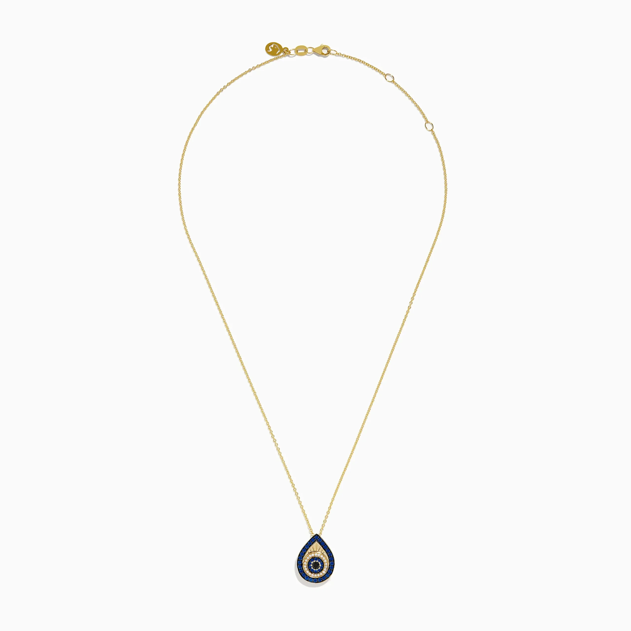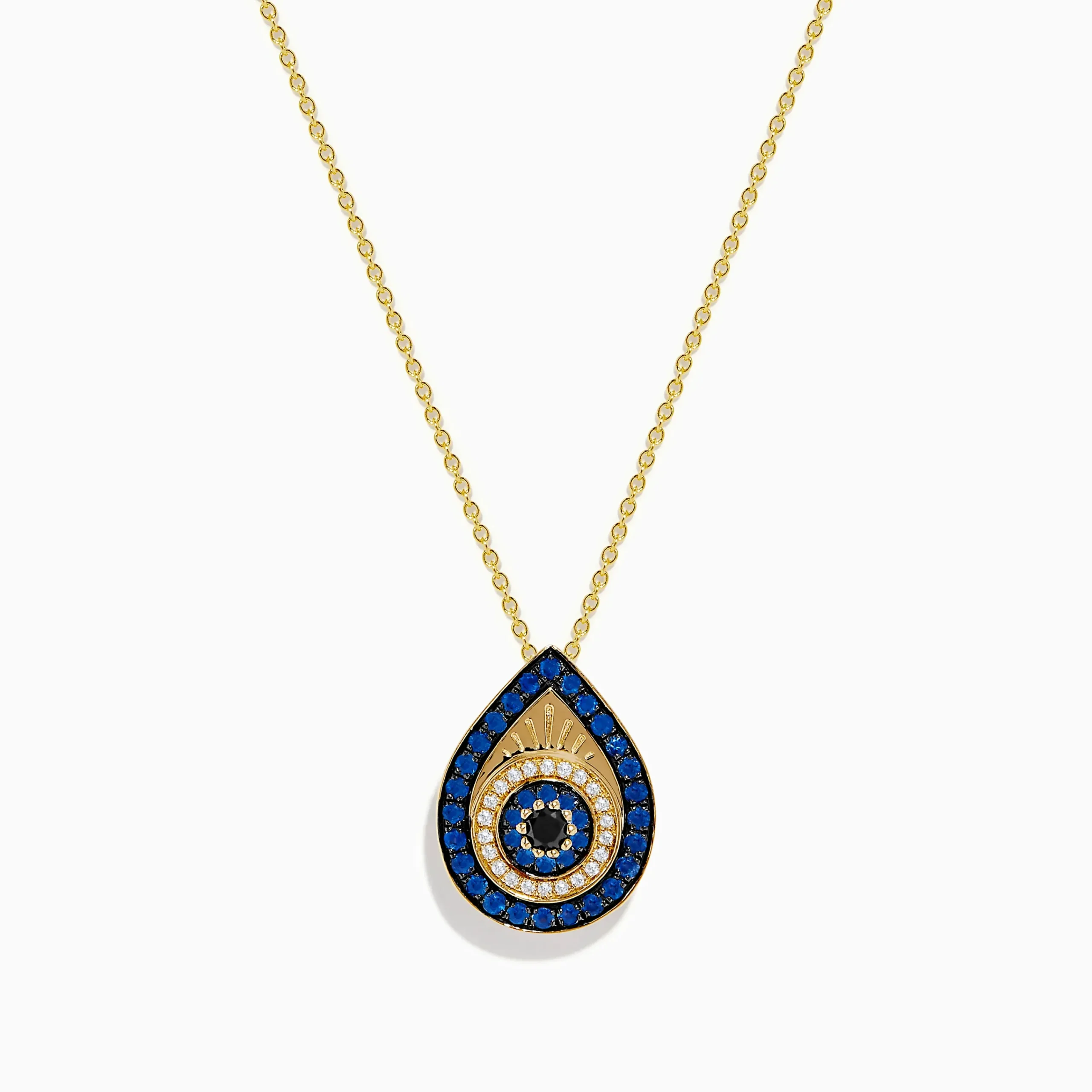 14K Yellow Gold Sapphire, Black and White Diamond Evil Eye Pendant