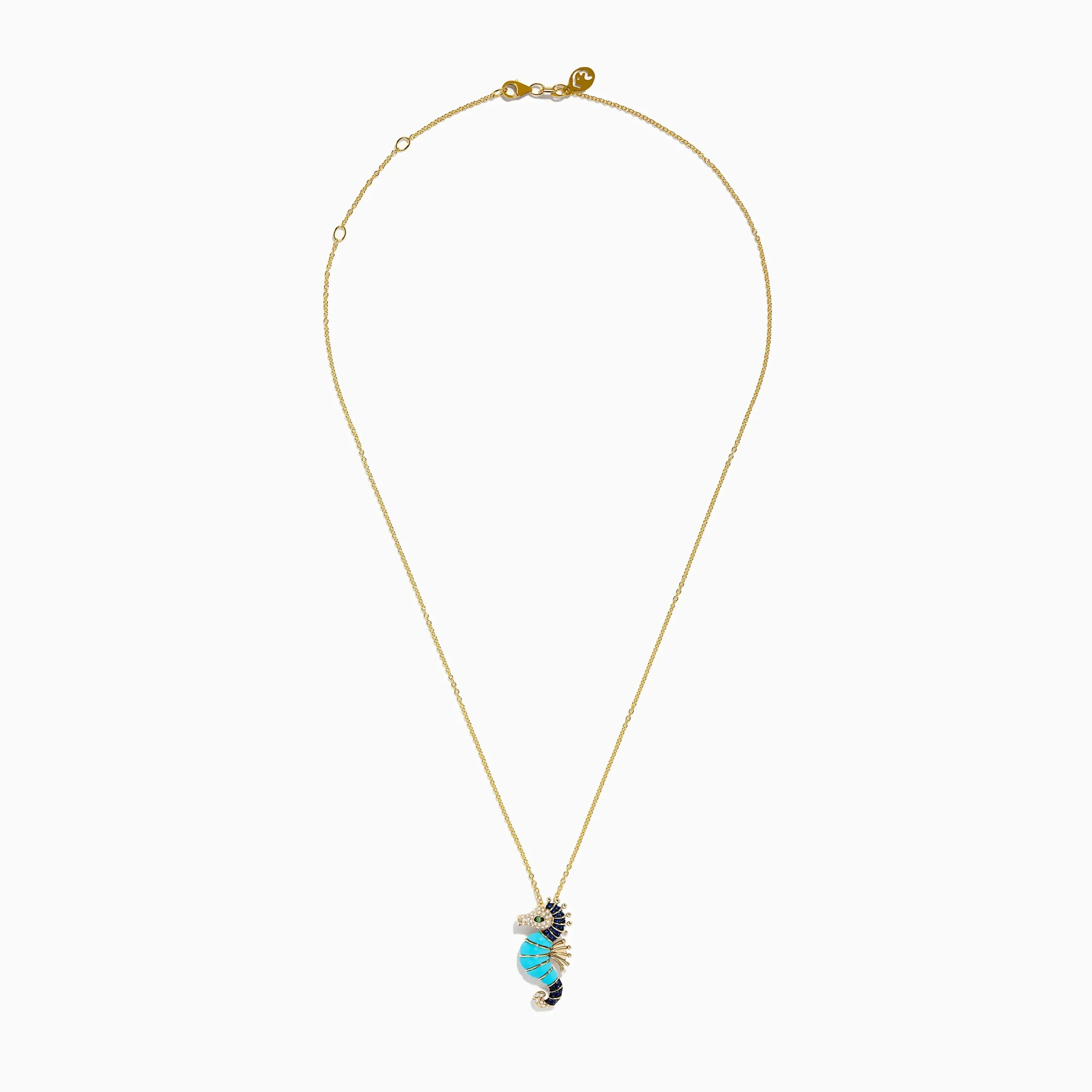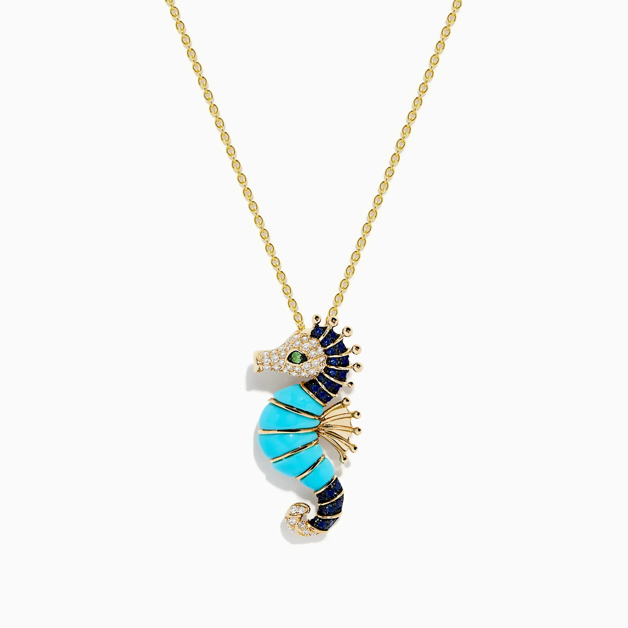 14K Yellow Gold Turquoise, Sapphire, Tsavorite and Diamond Seahorse Pendant