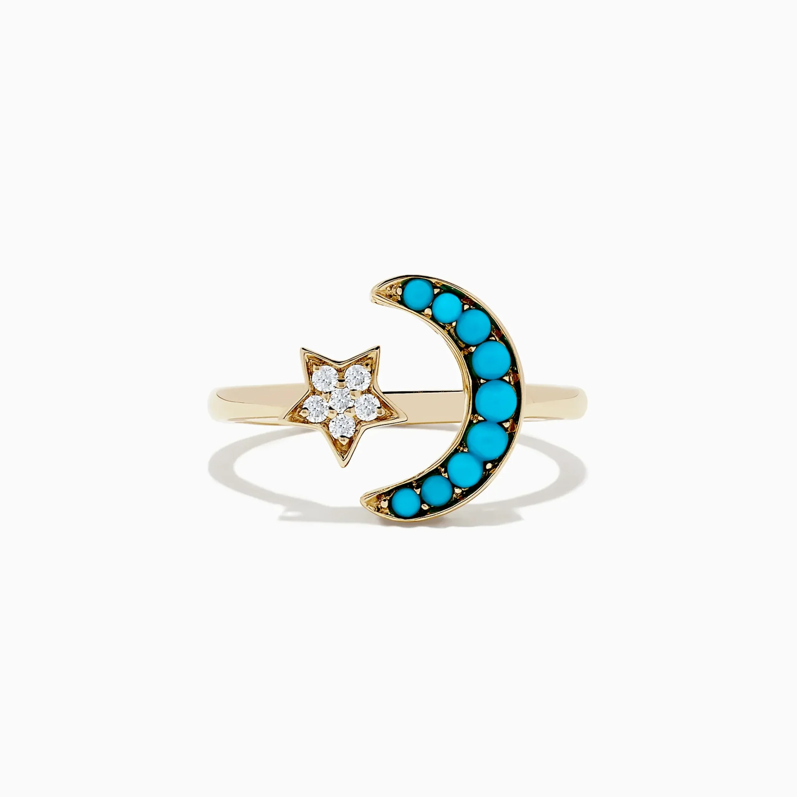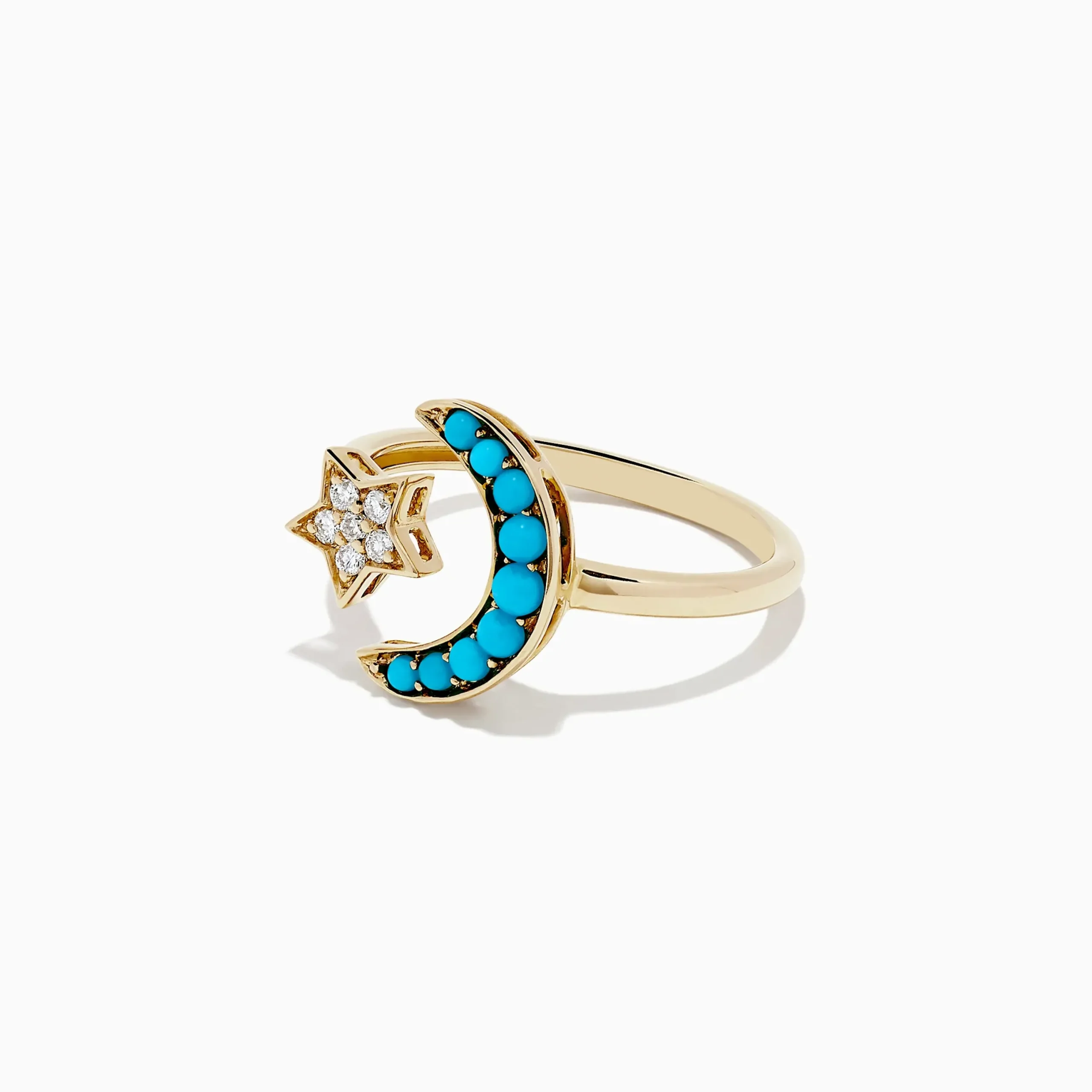 Effy 14K Yellow Gold Turquoise and Diamond Moon and Star Ring, 0.32 TCW