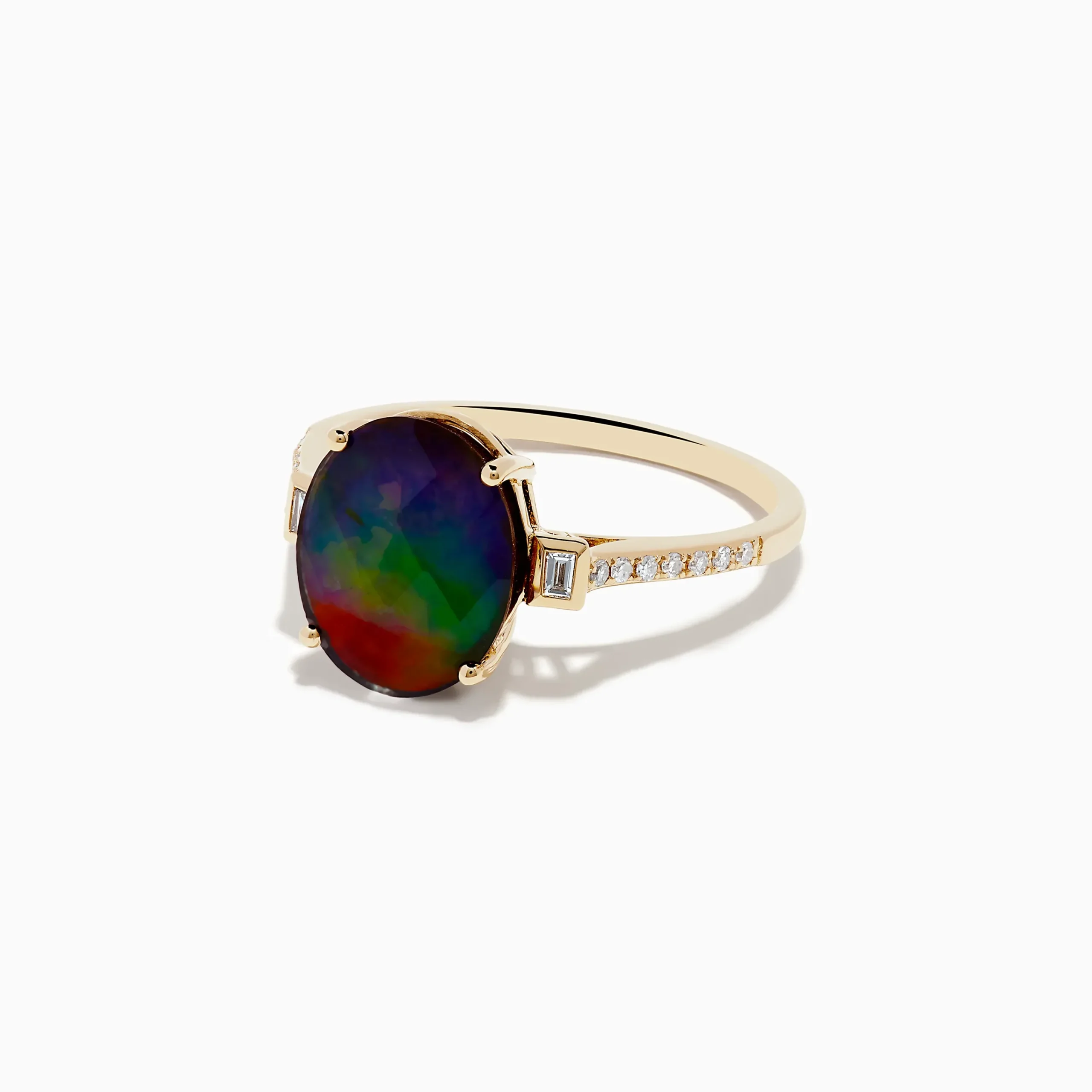 Metal:14K Gold Metal Color:YellowStone: Multi Shape Diamond 0.09 Stone 2: Oval Ammolite 2.614K Yellow Gold Ammolite and …