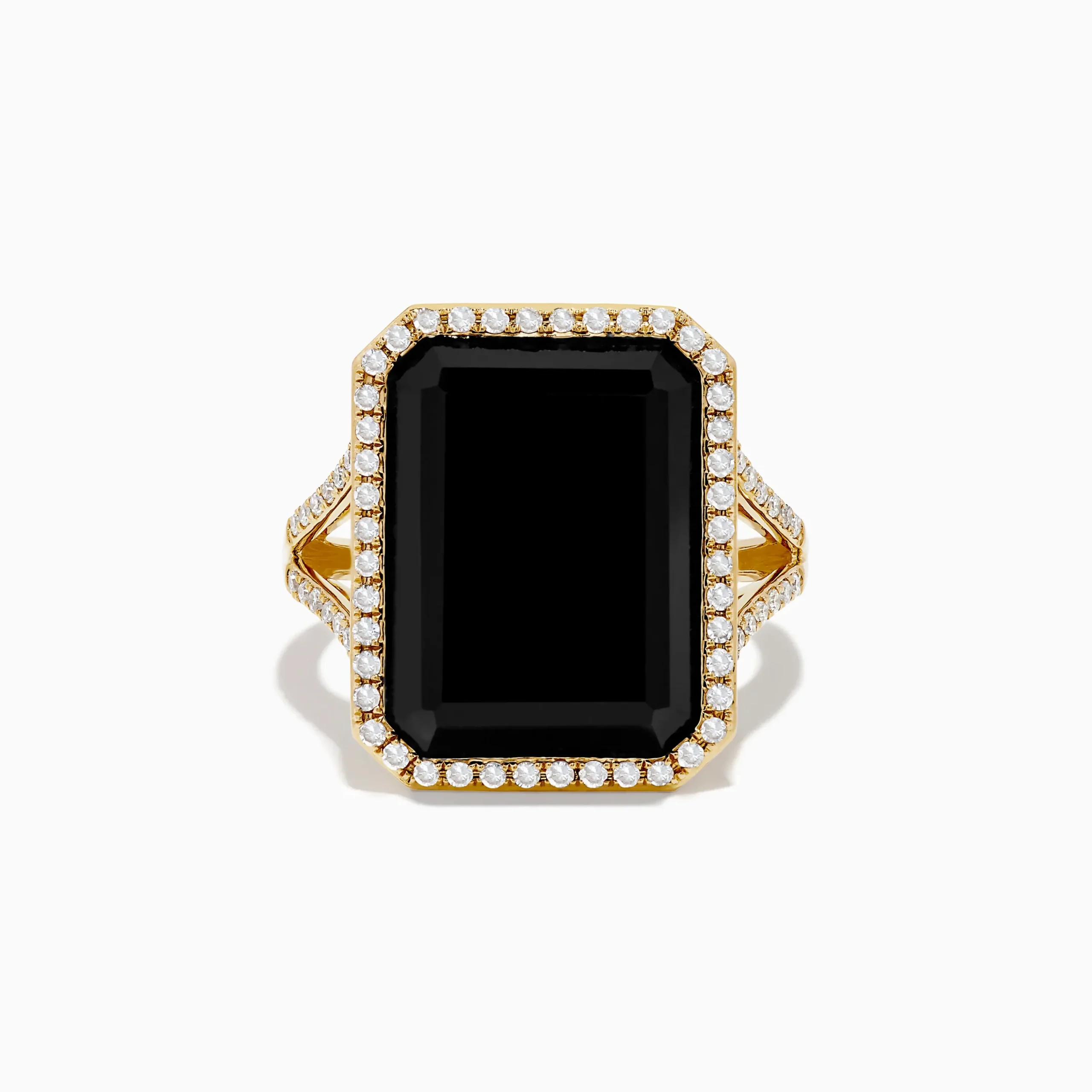 Metal:14K Gold Metal Color:YellowStone: Emerald Cut Onyx 6.8 Stone 2: Round Diamond 0.33 14K Yellow Gold Onyx and Diamon…