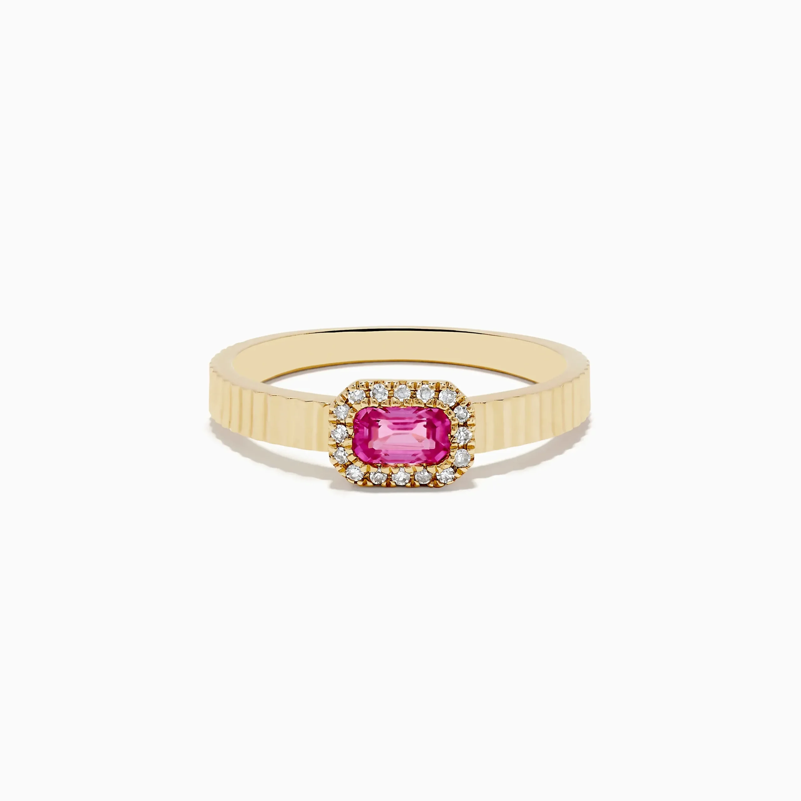 Metal:14K Gold Metal Color:YellowStone: Emerald Cut Pink Sapphire 0.33 Stone 2: Round Diamond 0.0814K Yellow Gold Pink S…