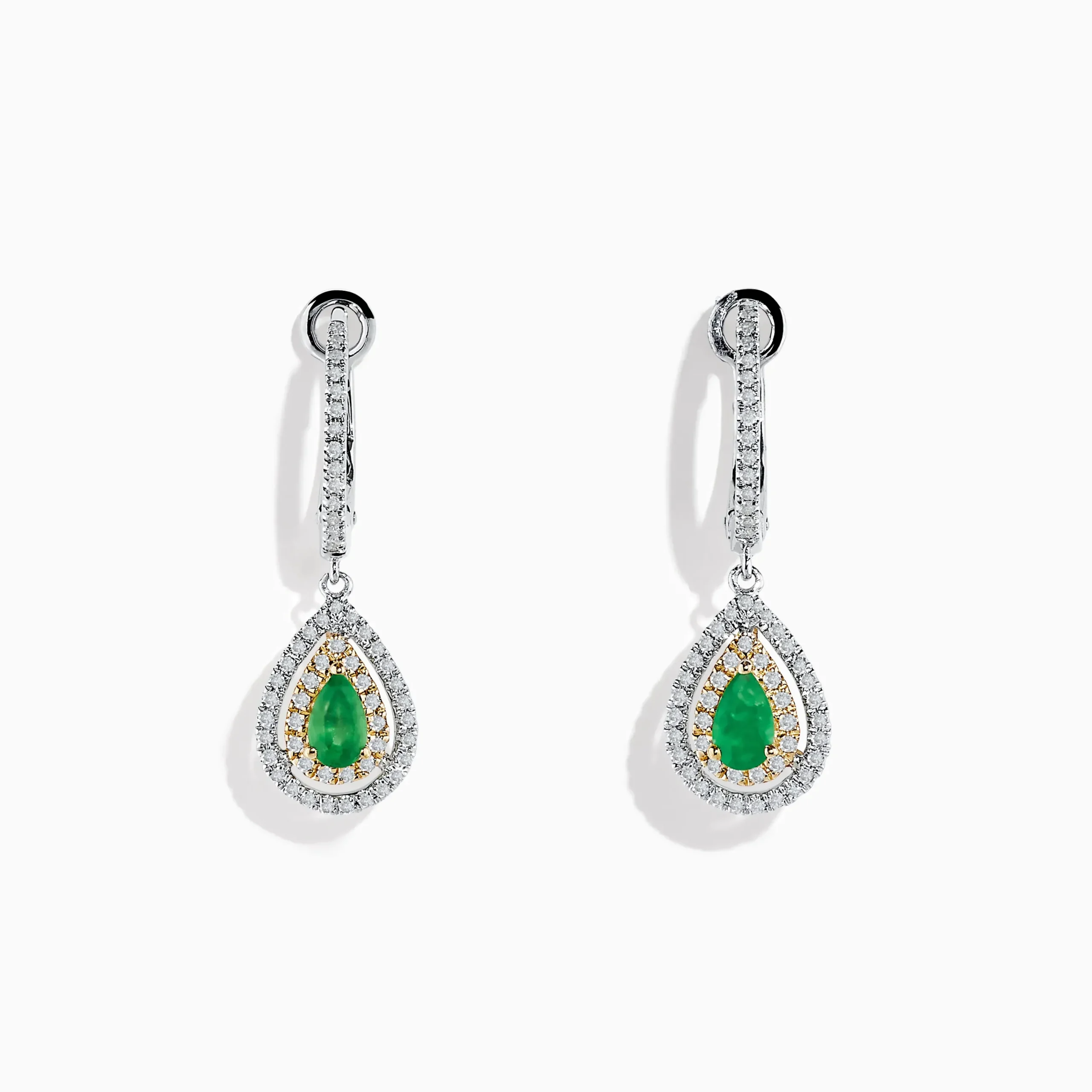 Effy 14K White & Yellow Gold Pear Shaped Double Diamond Halo Emerald Drop Earrings