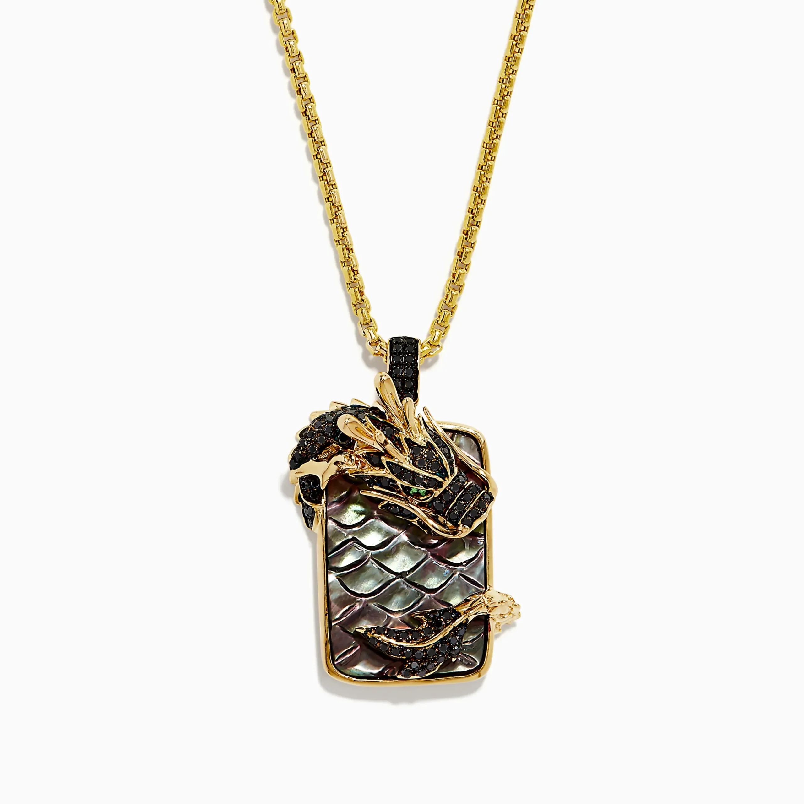 Effy Men’s 14K Yellow Gold Tsavorite, Black Shell, and Black Diamond Dragon Pendant