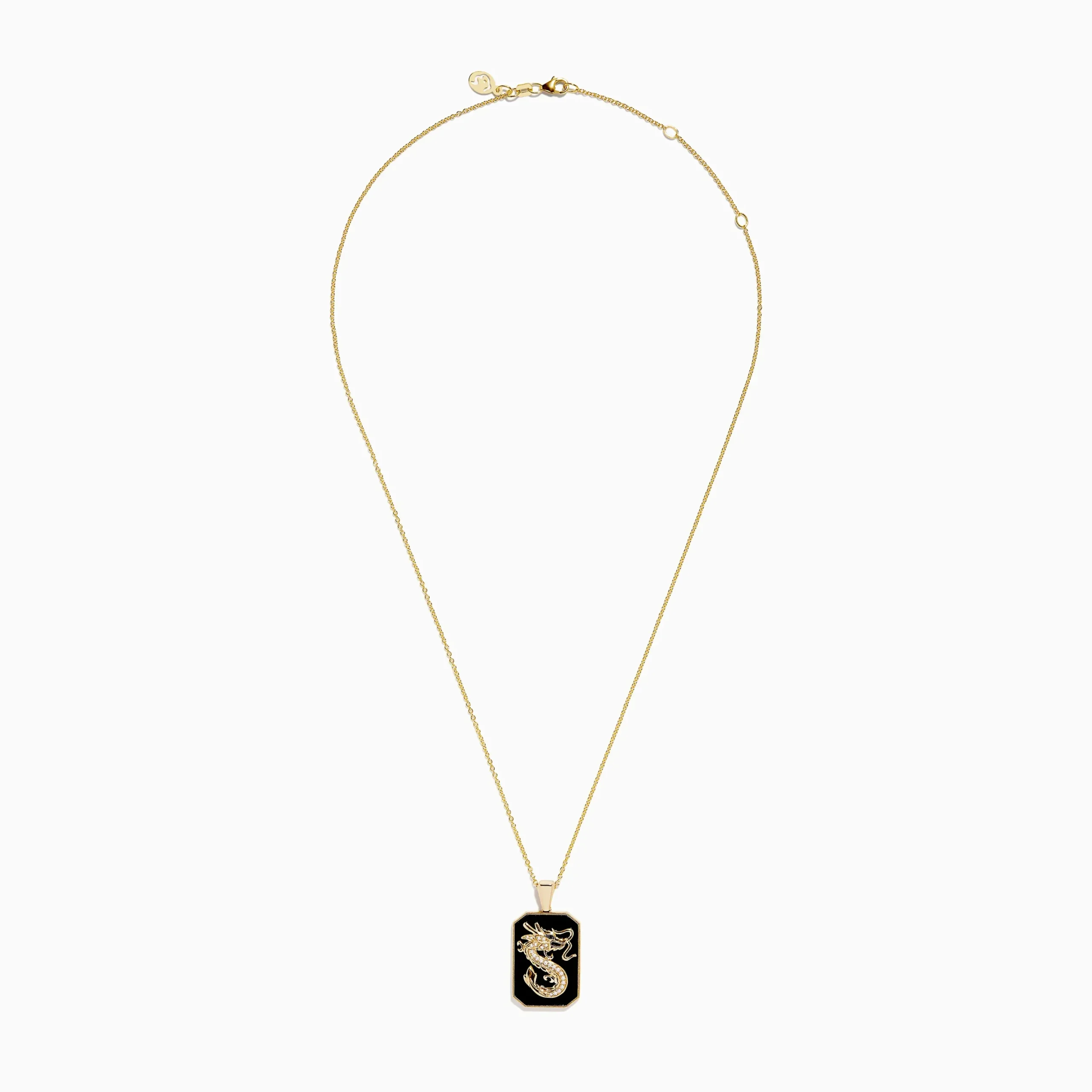Men’s 14K Yellow Gold White and Black Diamond Agate Dragon Dog Tag Pendant