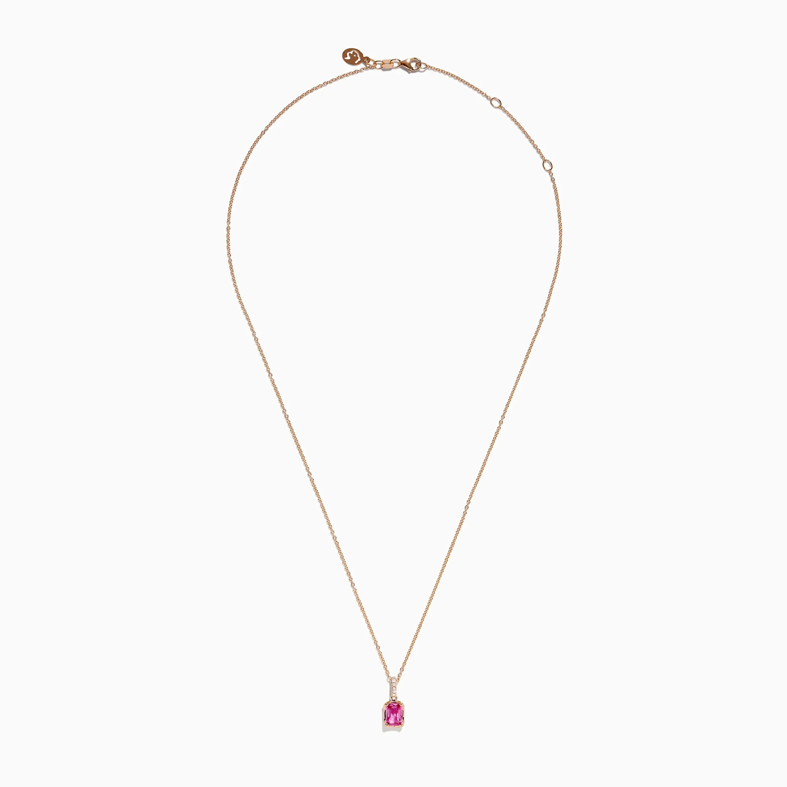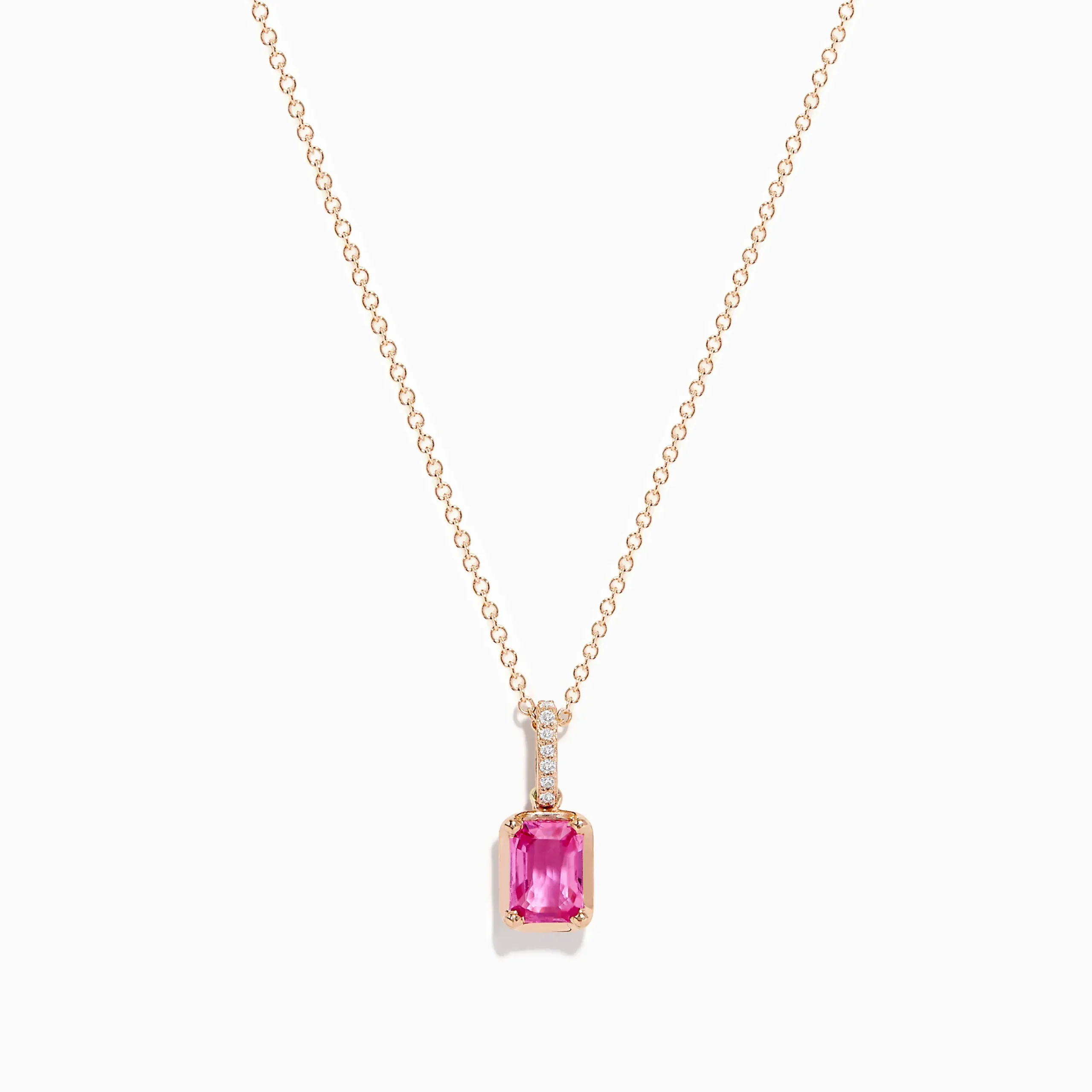 Metal:14K Gold Metal Color:RoseStone: Emerald Cut Pink Sapphire 1.05 Stone 2: Round Diamond 0.0314K Rose Gold Pink Sapph…