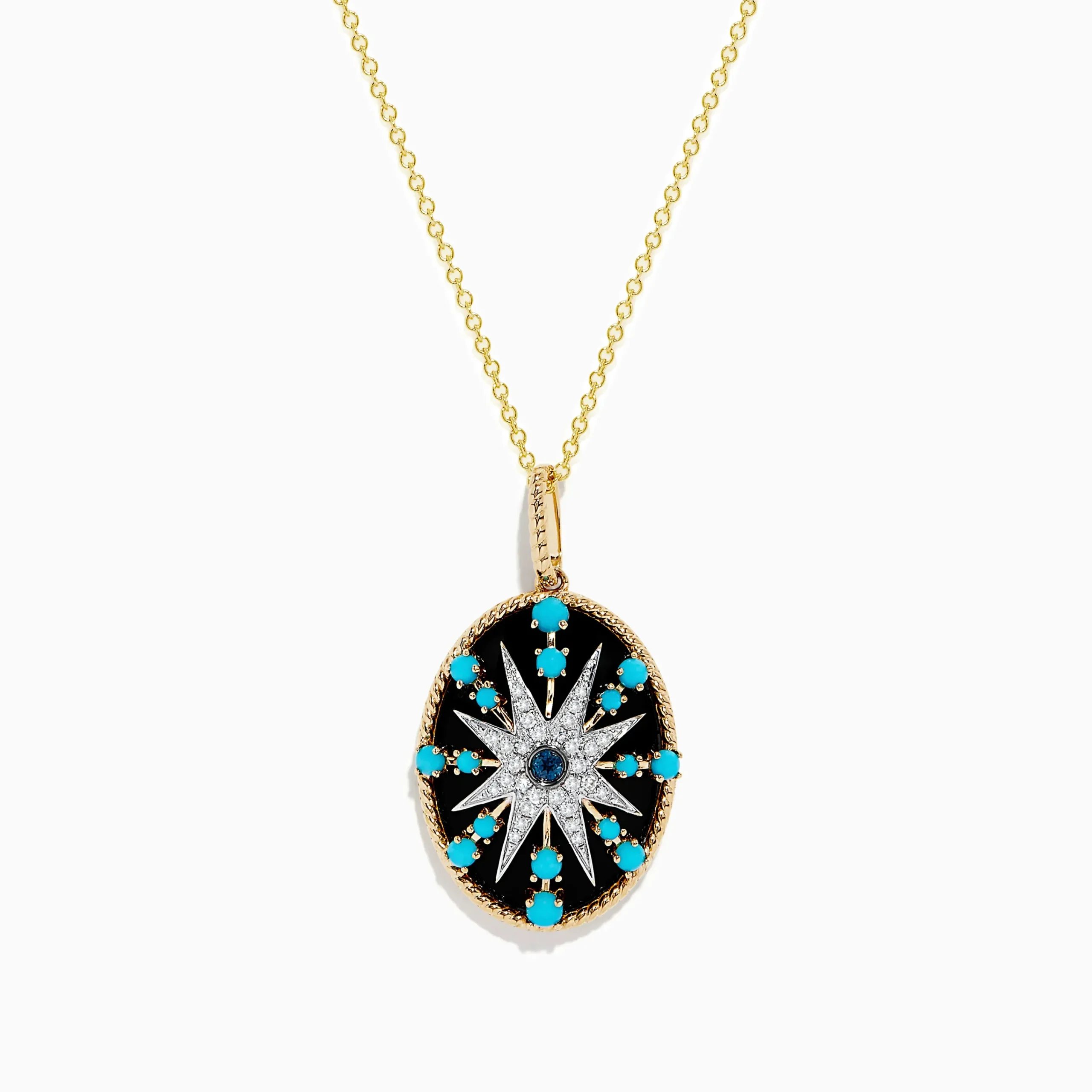 14K Yellow Gold Blue Topaz, Turquoise, Onyx and Diamond Pendant