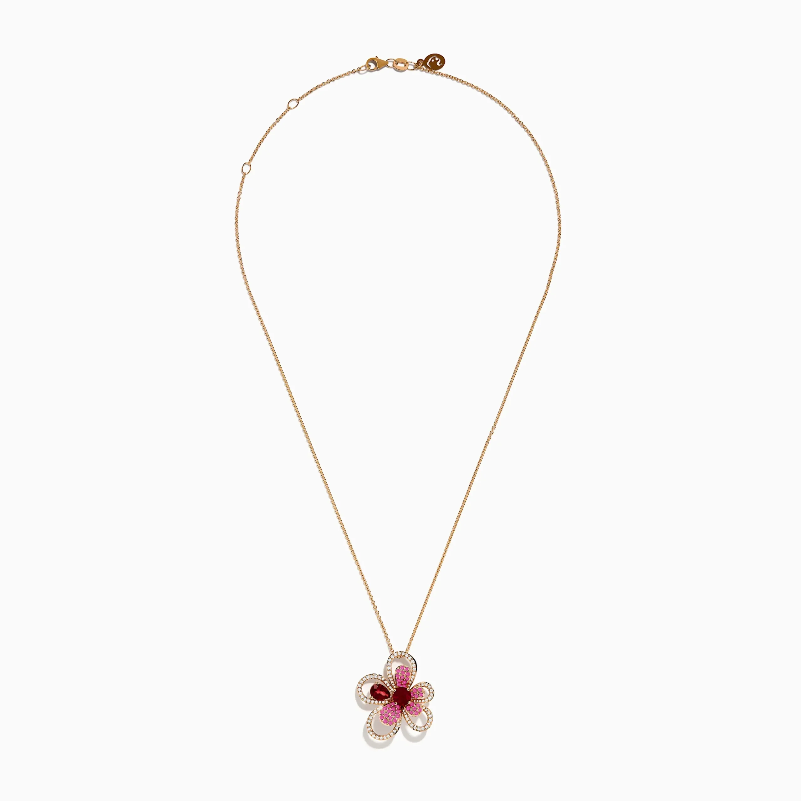 Nature 14K Rose Gold Rhodolite Pink Sapphire and Diamond Flower Pendant