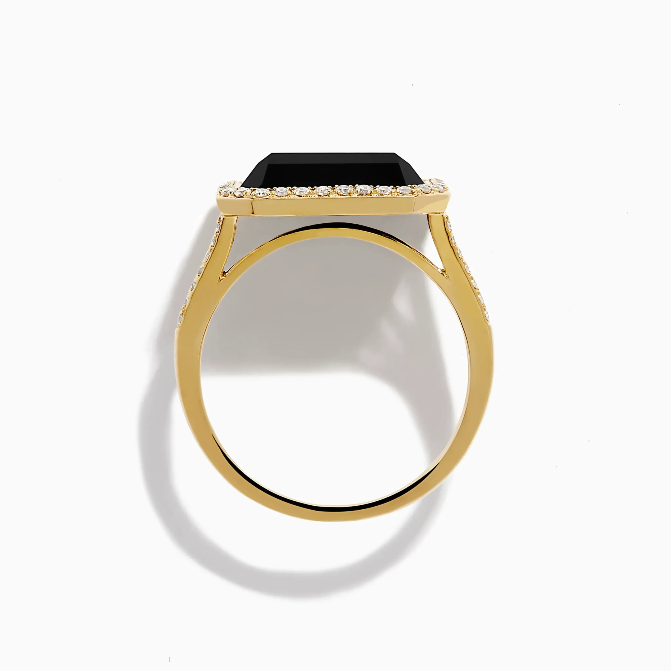 Metal:14K Gold Metal Color:YellowStone: Emerald Cut Onyx 6.8 Stone 2: Round Diamond 0.33 14K Yellow Gold Onyx and Diamon…