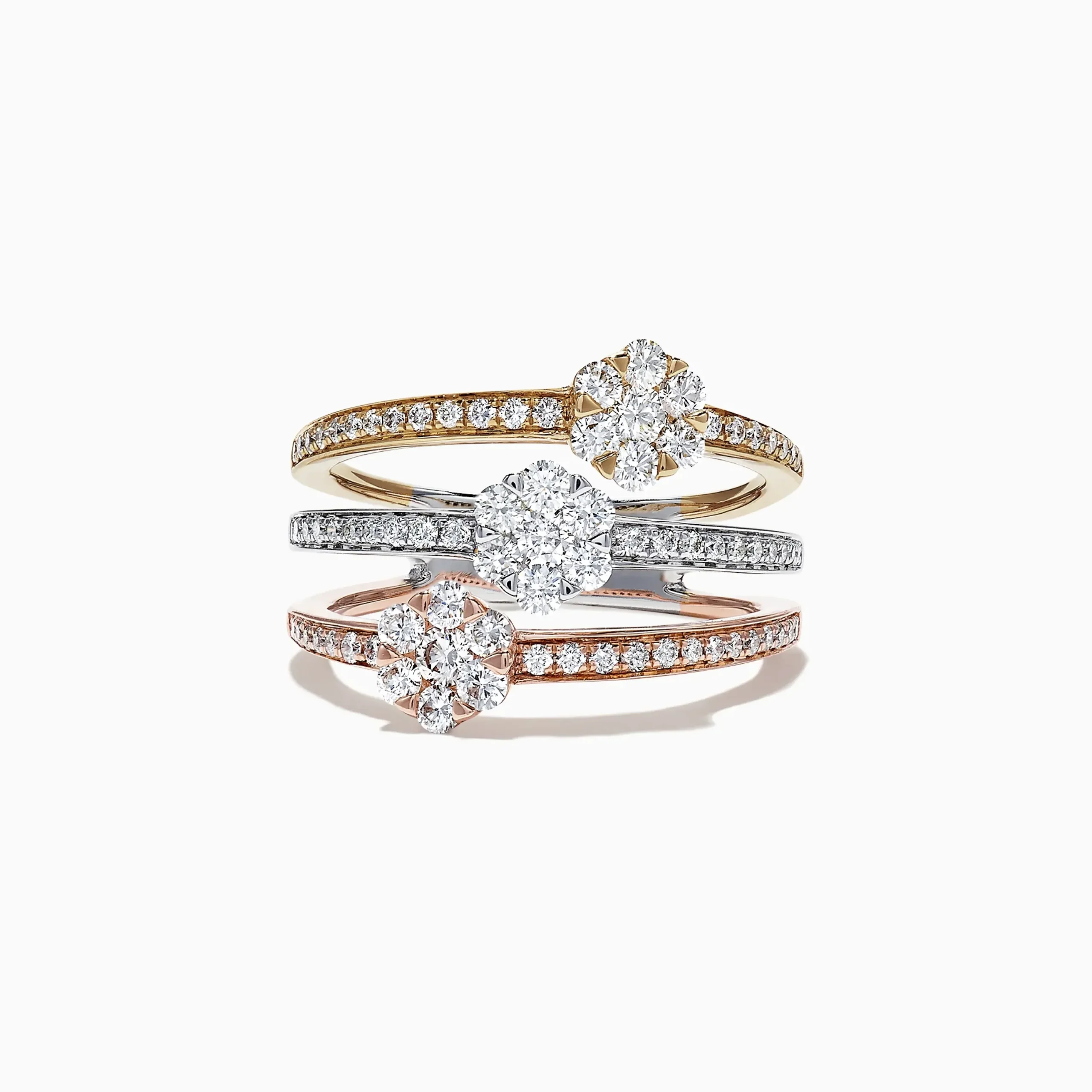 Metal:14K Gold Metal Color:Three ToneStone: Round Diamond 1.04Effy Trio 14K Tri Tone Gold Split Band Diamond Flower Ring…